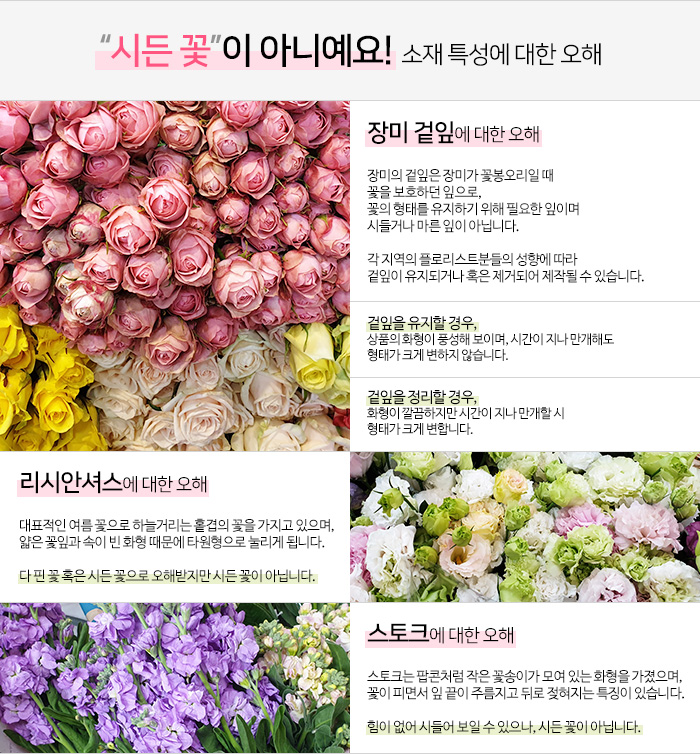 상품은 다년 간의 경력이 있는 전문 플로리스트가 싱싱하고 신선한 재료만으로 최고의 상품을 만들어 드립니다.